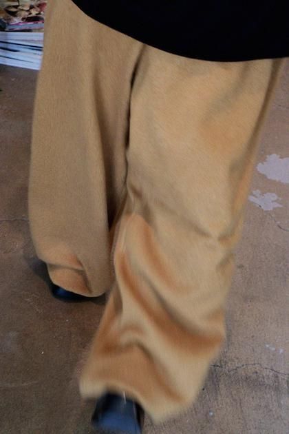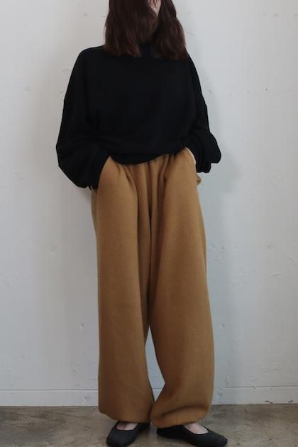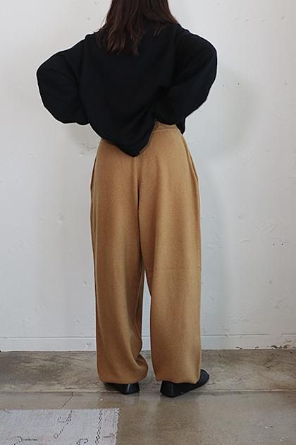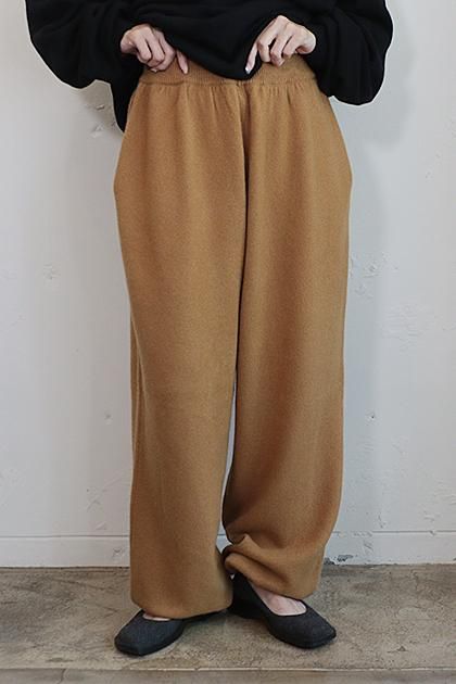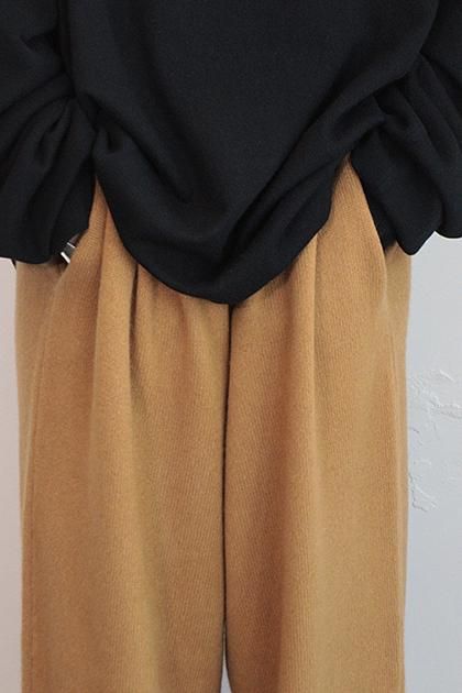 一見すっきりとした表面感ながら、7Gのしっかりとした糸で 編み上げたボリュームのある天竺ニットパンツ。 外側のラインをバレルパンツのように丸めることで、独特の BONTANフォルムに仕上げています。 裾リブまでバランスよく、全体のシルエットを美しく保つ工夫 が光ります。ラフにデイリー使いを楽しめながらも、極上のカ シミヤ100%でしか叶わない、リッチな履き心地は手放せな い一枚に。