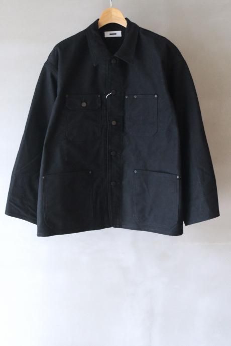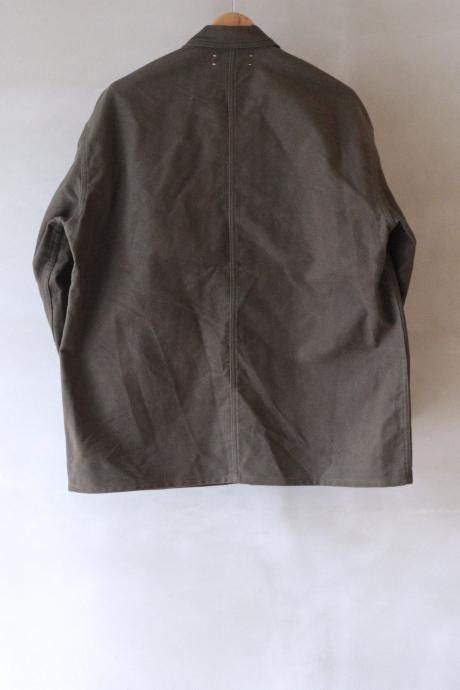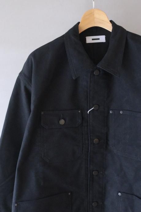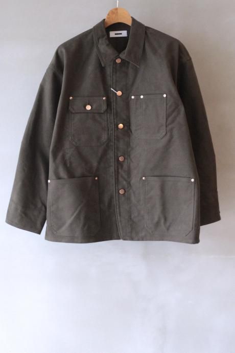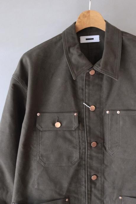 ワークのカバーオールのディテールを採用しながらも、生地の当て込みやパターンワークによりモダンに仕立てている。メタルボタンやリベットも経年変化していくと生地色に馴染む様になっている。超高密度のモールスキンを使用。