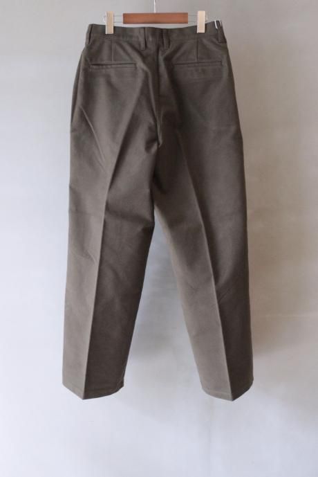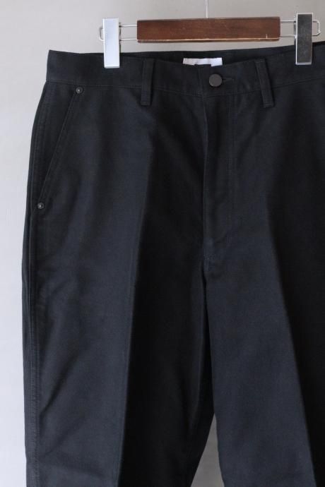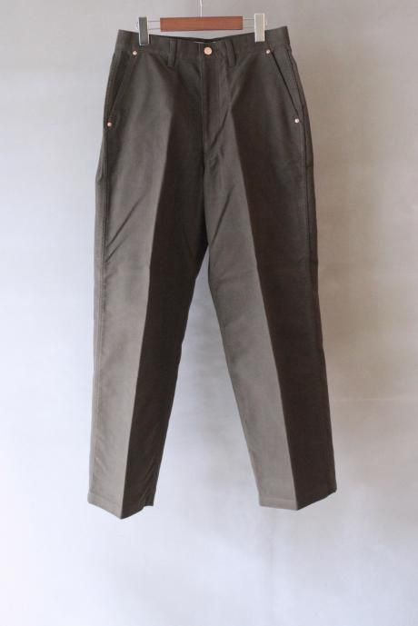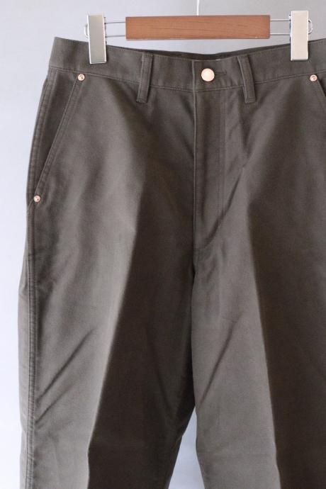 ワークのディテールを採用しながらも、スラックスの型紙を展開し、美しいシルエットになっている。メタルボタンや、リベットも経年変化していくと、生地色に馴染む様になる。超高密度のモールスキンを使用。