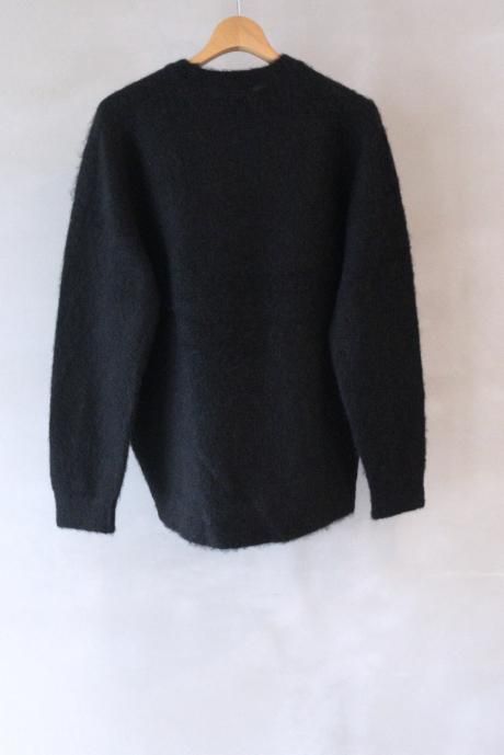 モヘヤ/ウール/ナイロンのミックス糸を使用したクルーネックのプルオーバーニットです。糸段階で起毛加工を施し毛足の長さを生かした風合いと、ストレッチ糸を混ぜた着心地に優れた仕様です。