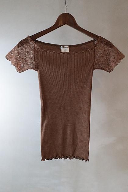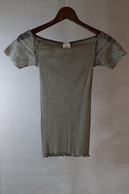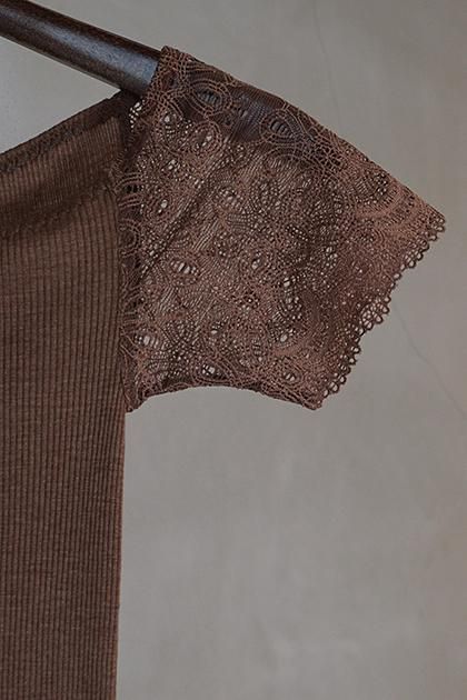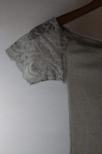 保温性とフィット感に優れた防縮ウールシルクのアンダーウェア。袖に肌あたりの良いコットンベースのストレッチレースを使用したオフショルダートップインナー。