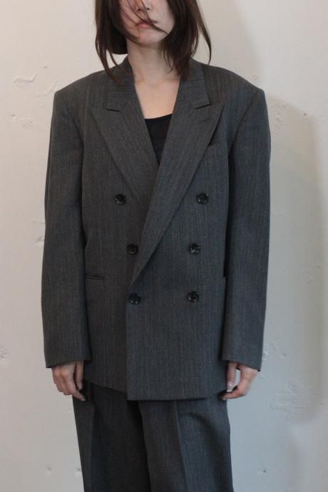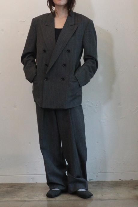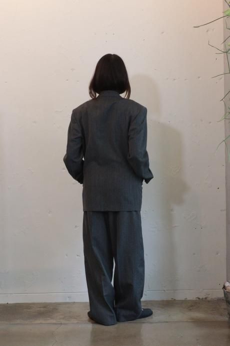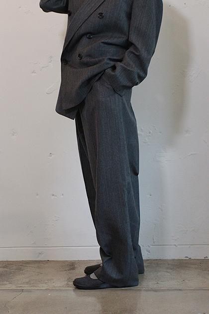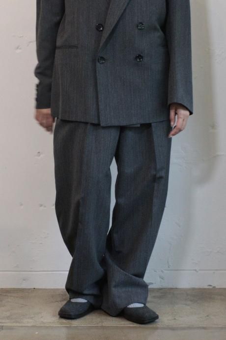 上品なヘリンボーン織で杢調の深みあるグレーが奥行きのある表情を生み出すスーチング素材を使用した2タックワイドテーパードスラックス。レーヨンをブレンドすることで程よい落ち感と柔らかなドレープでのボリュームを共素材のベルトで絞って着用。