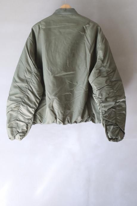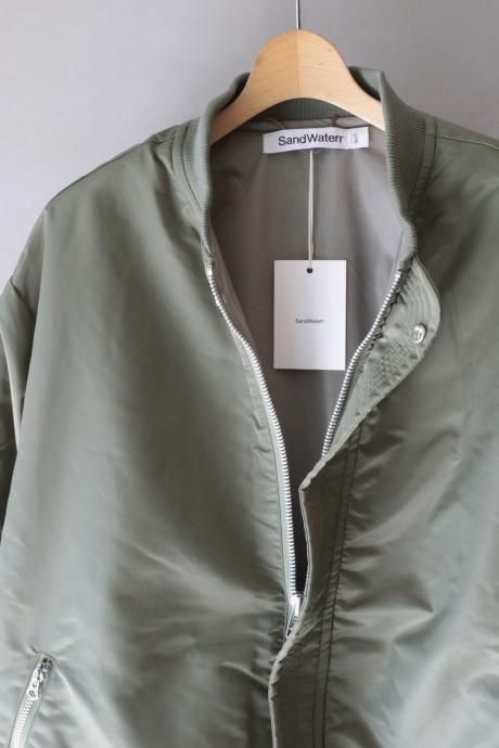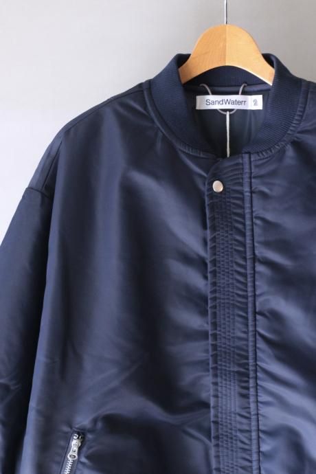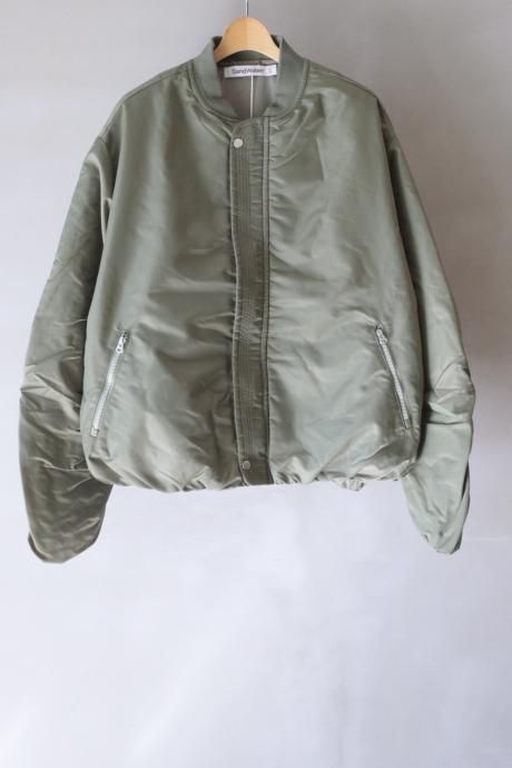 ミリタリーなどで採用さている肉厚でタフなナイロンサテン地を使用。程よい光沢感とビンテージライクな風合いが特徴的です。袖下のパッカリング縫製や全体的なシルエットがミリタリーウェアをインスパイアしたデザインになります。再生繊維から織られている裏地は制電性、ストレッチ性に優れています。ワンウォッシュ加工を施しています。