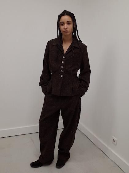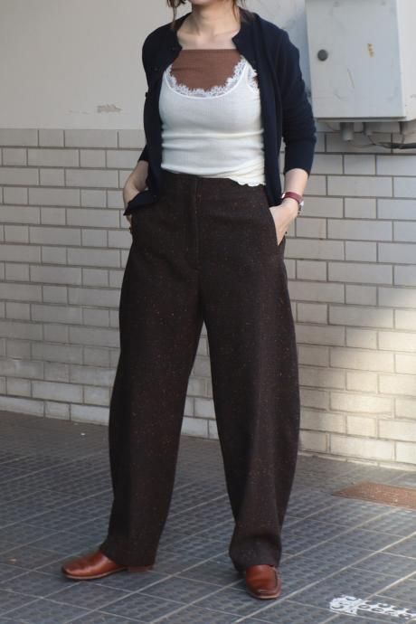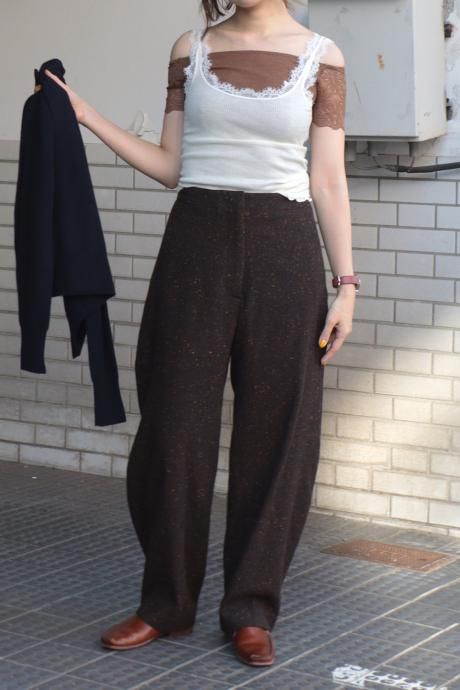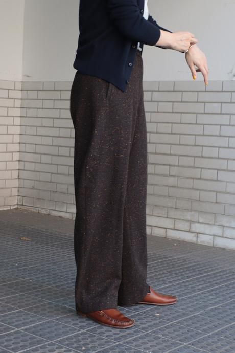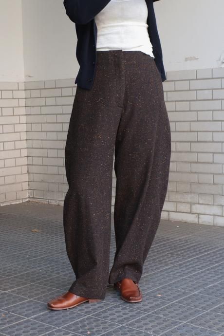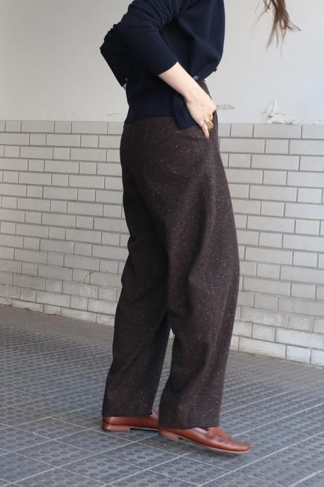 丸みのあるカーブしたシルエットが特徴的なパンツ。同素材のColor Nep Shirt Jacket とのセットアップもおすすめ。ブラウンベースにカラフルなネップのファブリックが素敵です。