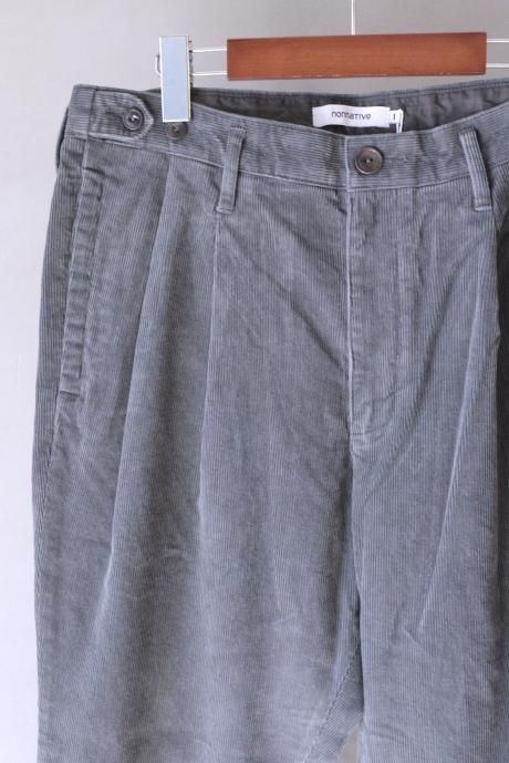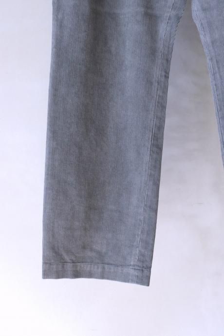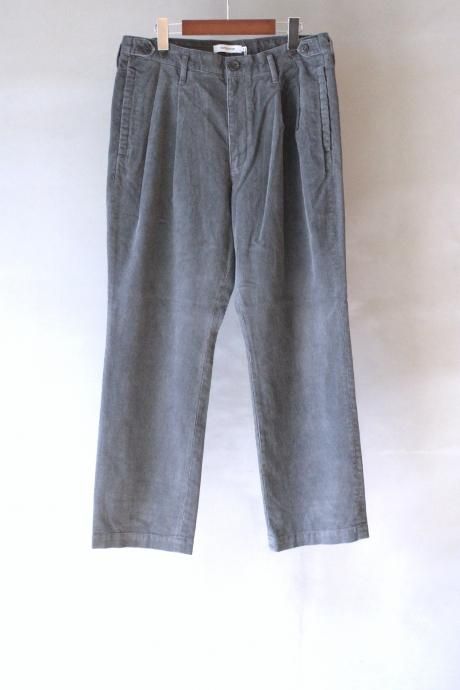 硫化染めコットンコーデュロイを使用した2タックのチノトラウザーです。腰回りにゆとりを大きく取り、膝下から裾にかけて細くなるテーパードシルエットです。ウエストにボタンアジャスターを設けており、サイズ調整が可能な仕様です。