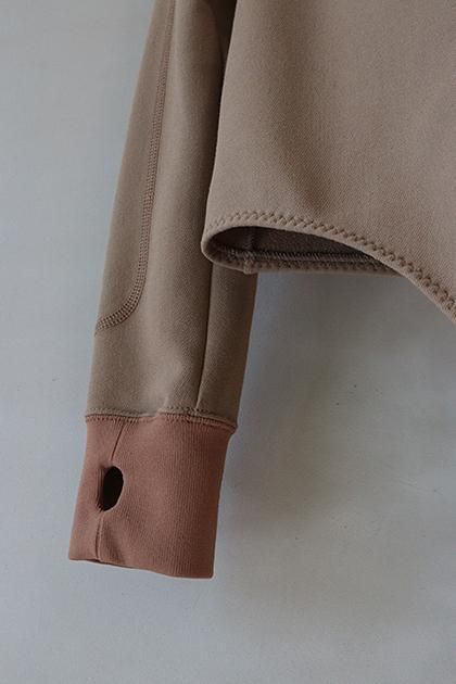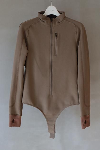 フレンチテリーの編み構造を活かし、形が崩れにくくすっきりとした見た目と滑らかな肌触り、ストレッチ性を実現した織り、素材で作るボディースーツ。アウトドア由来の機械的な