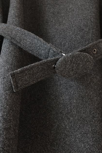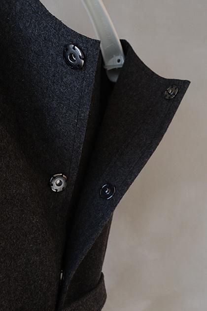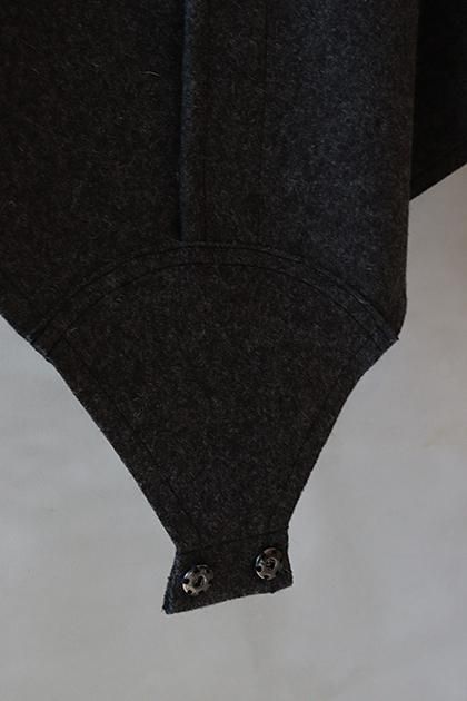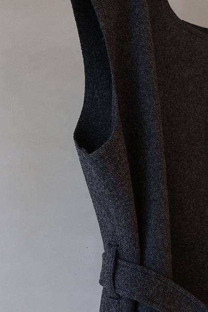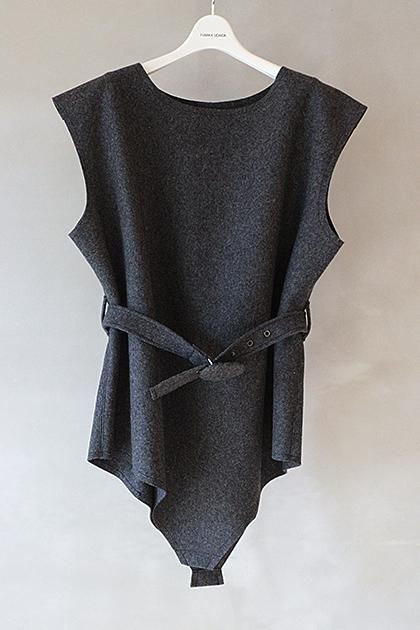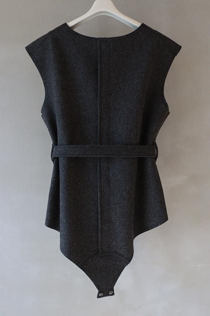 100%ウールを使用し、受け継がれてきた織機と技術によって手作業で織り上げられた フェルト素材を使用したオーバーサイズ、シルエットのボディースーツ。フェルト特有の構築的な質感で身体に沿わず、距離のある立体的なシルエット。ウエストにつく共素材で包んだ楕円型バックル付きのベルトで着用。