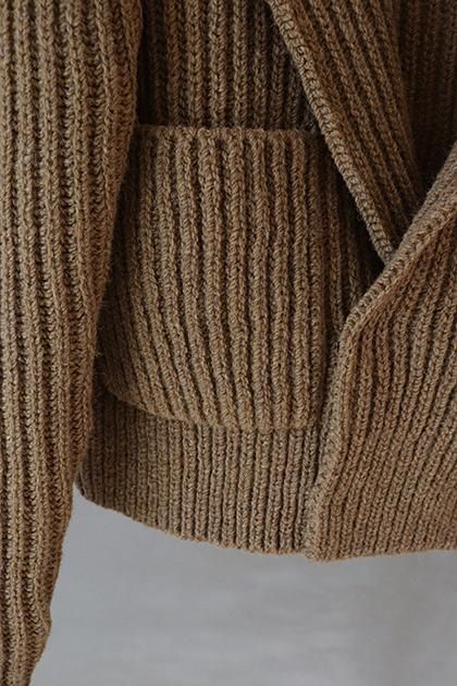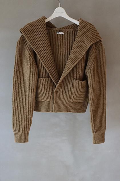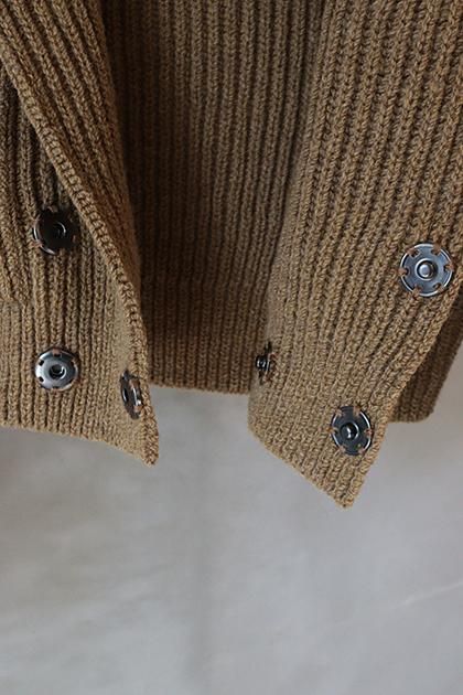 シェットランドウールをベースに3種の羊毛をブレンドし紡績したオリジナルの糸を使用。畦編み特有の厚みと弾力により、フードに自然な立体感を持たせ、ボリューム感のあるシルエットに仕上げたカーディガン。フロントスナップ開き。