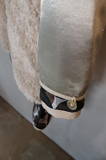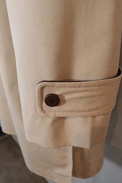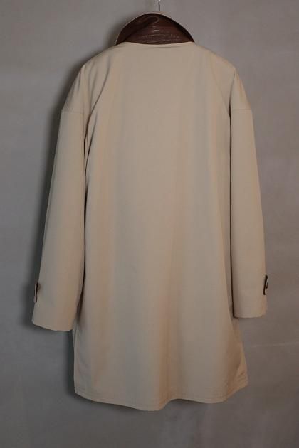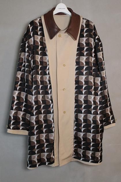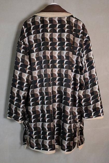 上質な糸の自然な光沢ときめ細やかさに、しっかりと厚みと膨らみがある風合いに仕上げたコットンポプリンを使用したステンカラーコート。裏地はスクリーンプリント特有の柄の繊細さ、滲み、色の奥行きで立体感のあるジオメトリック柄を施したキュプラ素材を使用。着脱可能なライナーに保温性に優れたボアフリースを使用。