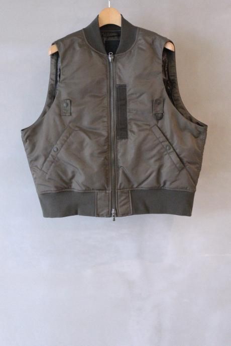 タテ糸100デニール×ヨコ糸200デニールを使用した高密度ナイロンツイル素材。肉厚過ぎない中厚地を採用。軽量性、破れにくい特長を持った頑丈な素材。アメリカ軍の初期型MA-1フライトジャケットを彷彿とさせるダウンジャケットをアレンジ、袖をデタッチャブル仕様にし、ベストとしても着用が可能なデザインに昇華。フライトジャケットのディテールである、酸素マスクを留めておくためのオキシジェンタブは胸ポケットに、両脇に備えられた当時ICSの音声プラグコードの固定用コードループは釣果を記載する際の1本分のペン差しとしてそれぞれアレンジ。インナーには複数のインサイドポケットを配しており、十分な収納力を持ち合わせている。ミリタリーのディテールでもある前振りの袖がデザインアクセント、アクションプリーツを加え、腕の可動域を広げられるように考えたデザイン。