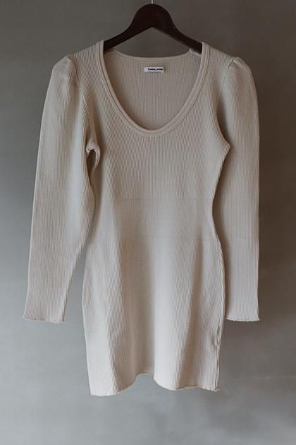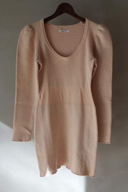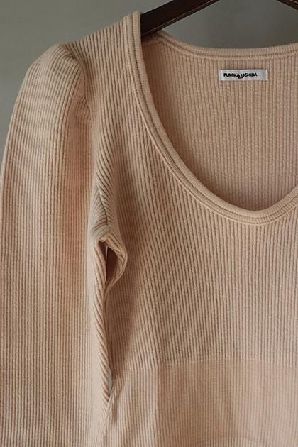 ナチュラルな⾵合いと肌触りの良い未防縮ウールを使⽤した、Uネックアンダーウェア。ウエスト部分は⽷の本数を変え編み⽴てることで⽴体感と着⼼地、シルエットにメリハリを持たせたニットソー。